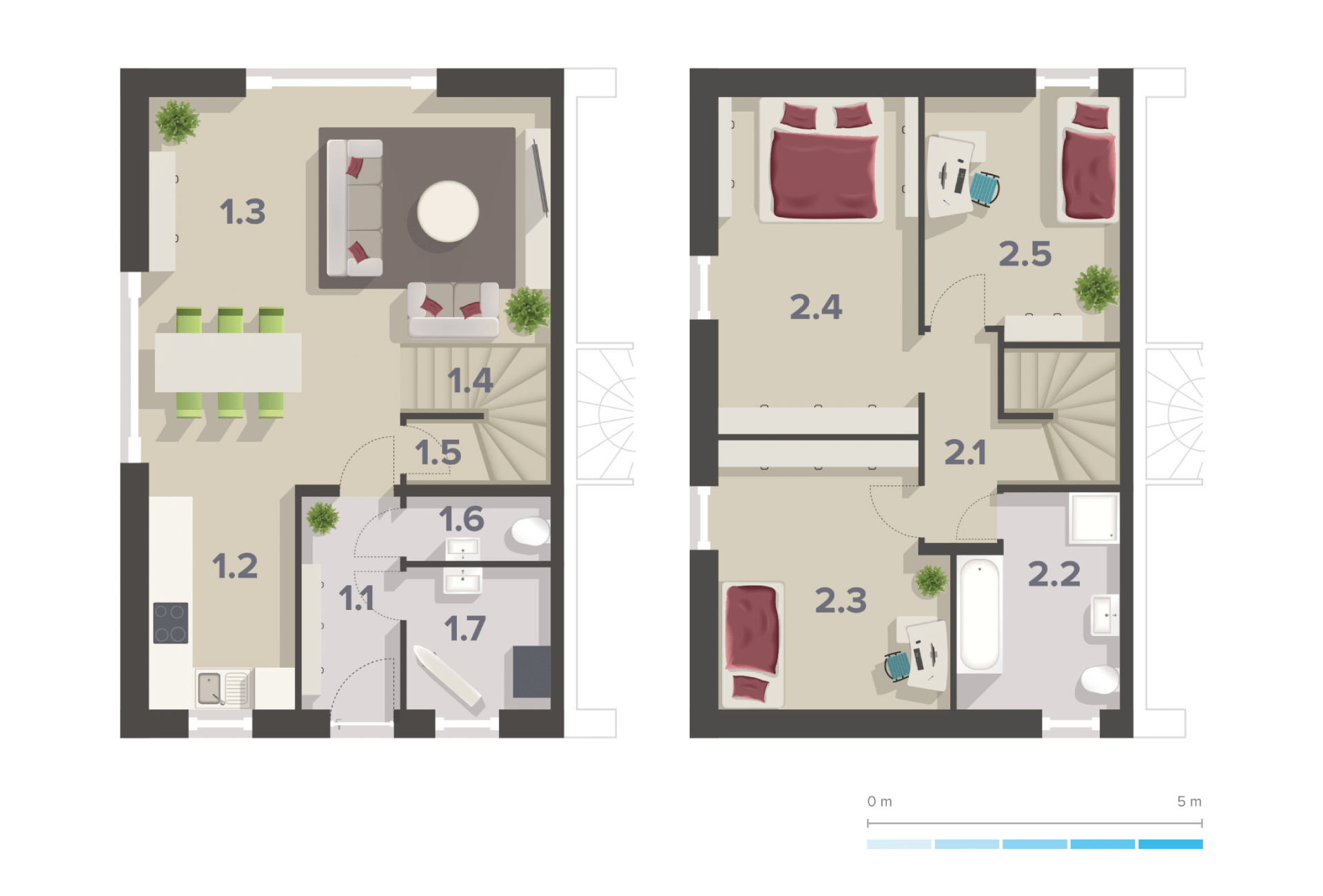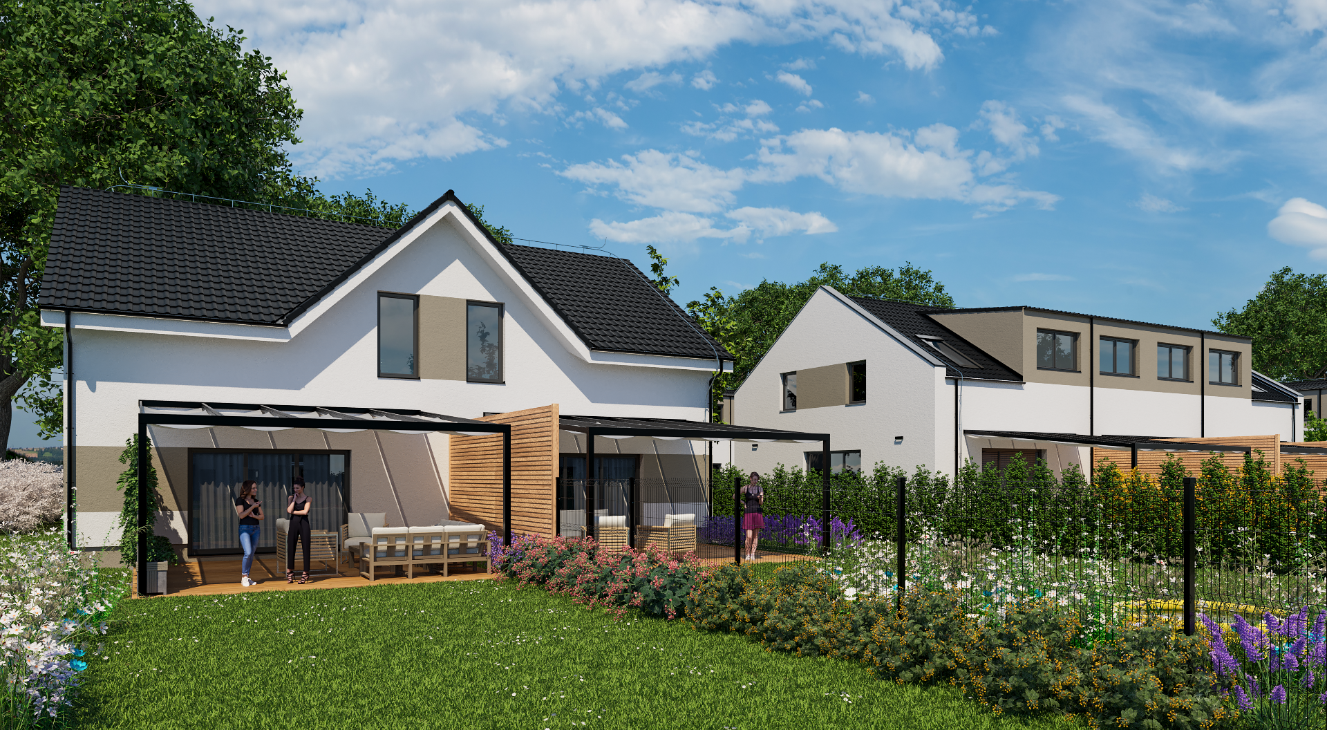 Moderně architektonicky řešený dvoupatrový zděný dům s dispozicí 4+kk, vlastní volbou vnitřního vybavení a zahradou.